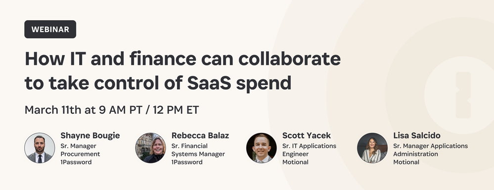 Join this webinar to hear from 1Password leaders Shayne Bougie and Rebecca Balaz as they share how they moved from fragmented tools and reactive cost cutting to clear ownership, real-time visibility, and measurable savings. Then, in a fireside chat, Motional’s Lisa Salcido and Scott Yicek reveal how a complete view of their SaaS ecosystem helped them eliminate waste and optimize spend across the business.