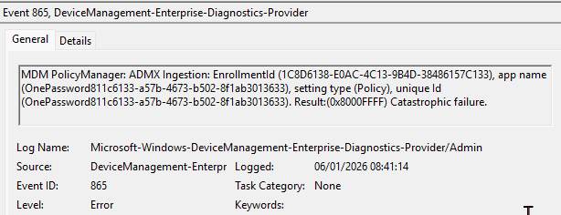 The 1Password for Desktop 8.12.0 release seems to have fixed and creates a new template which I just tried and it fixed the Intune ingestion for me.