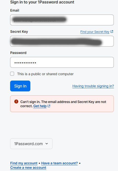 I am setting up 1Password on my PC, and have a printout of my "emergency kit". When I try to sign in, I get asked for my email address, secret key, and password. I copy the email address and secret key from my emergency kit, and add my password, but get a message saying the secret key and email address are incorrect. I have the printout in front of me, and have confirmed that what I have filled in is absolutely correct. So what do I do now?