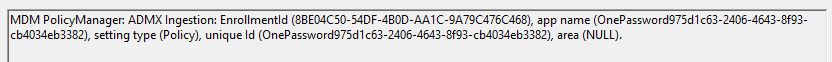 MDM PolicyManager: ADMX Ingestion: EnrollmentId (8BE04C50-54DF-4B0D-AA1C-9A79C476C468), app name (OnePassword975d1c63-2406-4643-8f93-cb4034eb3382), setting type (Policy), unique Id (OnePassword975d1c63-2406-4643-8f93-cb4034eb3382), area (NULL). - Policy Creation: