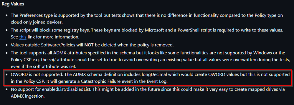 As the error appears to be related to the ADMX Ingestion not being able to handle QWORD-values, the root cause of the problem may lie with Microsoft. Would it be possible from 1Passwords side to look into having the two policies be handled through either a DWORD or a String instead of a QWORD?