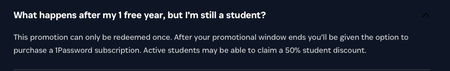 I have a GitHub education free trial for last year, and my free trail have been expired today. I fount that the page in 1Password for student mentions that the students are able to get a 50% dis...
