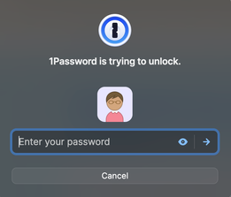 First, let me introduce how I use 1password. Sometimes I enter the master password, but I also have let it use my biometric (Touch ID). Compare the bottom-right corner of these two screenshots: