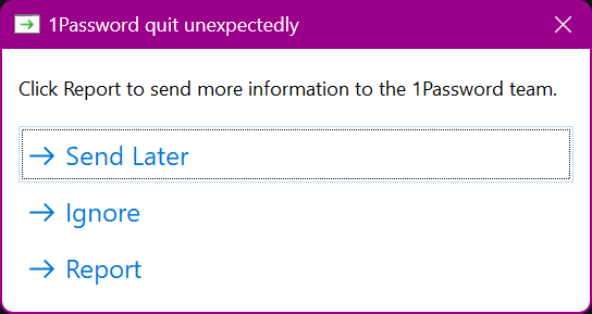 Result: 1Password insta-crashes and all related windows disappear, along with the tray icon. When you relaunch 1P, you get this error. I always hit Report.