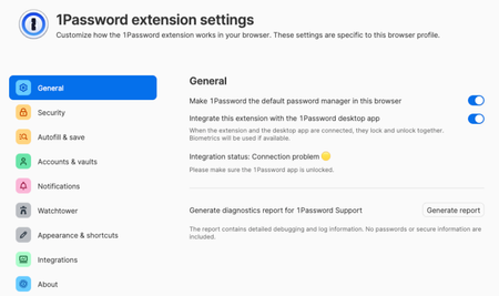 8. Turn "Integrate this extension with the 1Password desktop app" off and then back on.