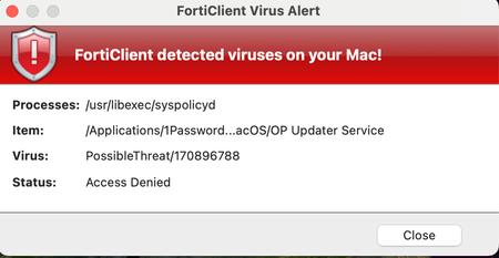 I was using 1password for my work computer and for the first time ever i got a virus alert for 1password from forticlient vpn. Not sure if anything has changed for this to have been triggered. ...