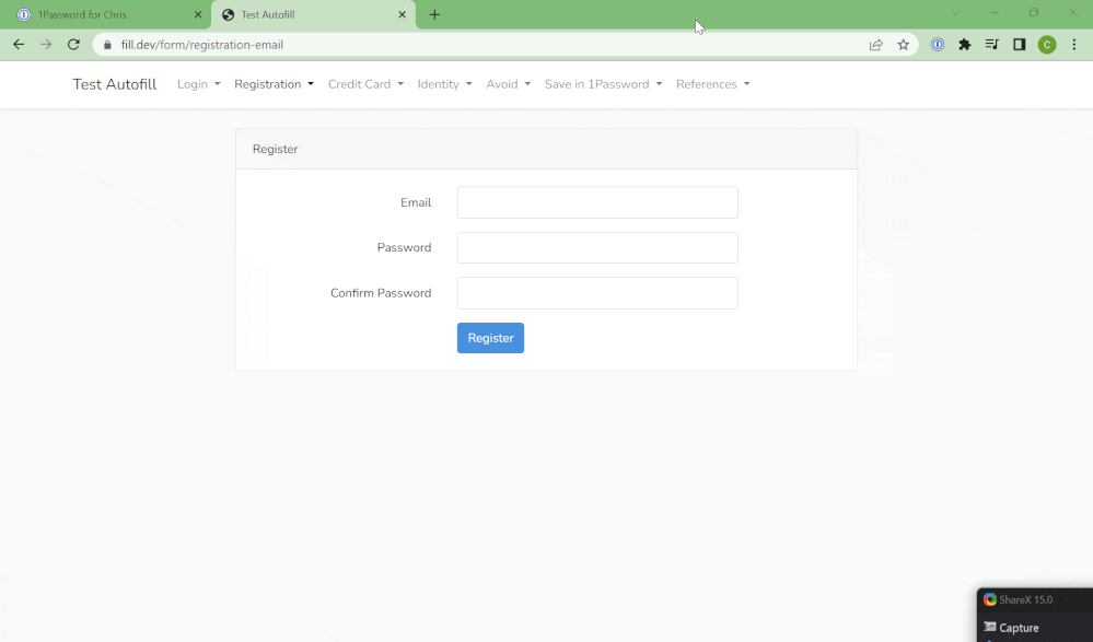 I populated it with an email address, then moved to the Password field, and was going to opt to use the suggested password, and it would not let me! The suggested password appeared, but I could not click to use it!So, I went ahead and manually typed in a password in both fields, and the "Save in 1Password" bubble appeared for those fields as well. I selected to save it, but received an unable to save item error: