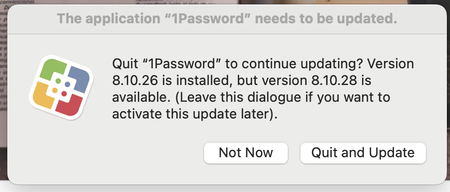 For the past several weeks there has been what I will call a pop-up window, advising me that there is a 1P update. Furthermore, it asks if I want to quit 1P and install the new version. Here is the p...