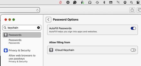 In Setting/Passwords/Password Options, only Keychain appears. Formerly, 1P...