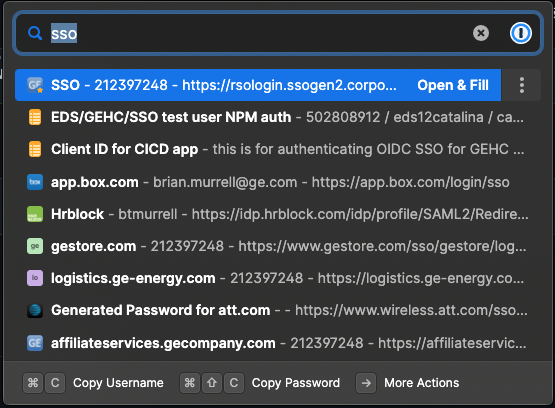 In v8, the UX has changed significantly here with a small result set. In the footer of the dialog (seen in the attached image) it has instructions for keyboard combos to copy user name and pw. It is not longer possible to do this with the mouse. This is a functionality loss. If nothing else, allow me to click on that screen text (make it a button?) to copy to clipboard for each the user name and password.