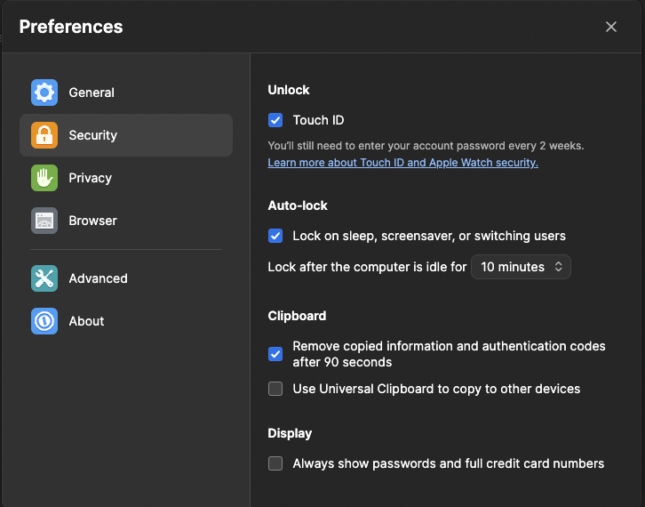I am seeing some odd behavior with these preferences. For myself, I'm currently using an M1 Mac Mini, which is set up to unlock via Apple Watch, but does not have Touch ID. In 1Password's preferences I'm seeing a Touch ID option and no Apple Watch option. I've opened an issue for our development team to investigate further.