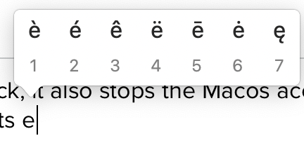 Whenever 1P8 causes the secure input feature to lock, it also stops the Macos accent menu feature to stop functioning. For example, if you long press the "e" key, you'll see a popup with a selection...