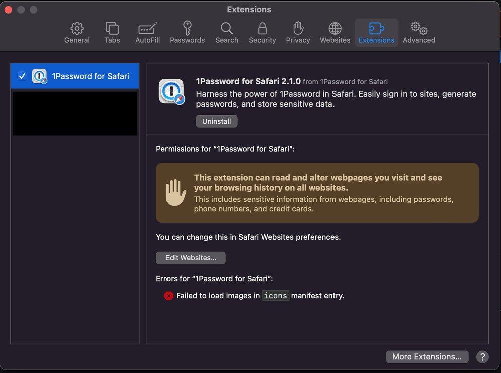 Ran the "1 Password for Safari.app" and the extension reappeared but when trying to enable it, received a pop up:Safari detected an app or service that interfered with clicking. To protect your privacy and security, this extension was not turned on. After quitting the app or service, you can try to turn this extension on again.