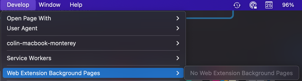 - Choose "Develop > Web Extension Background Pages > 1Password for Safari"
