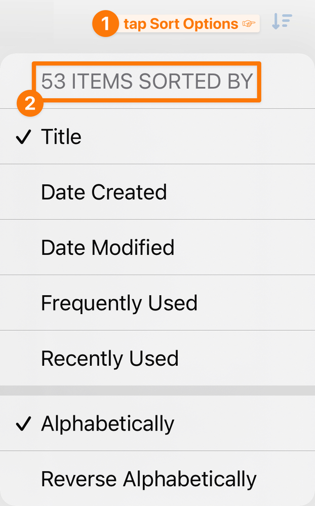 Clicking or tapping the Sort Options button in any list will show you how many items there are, like this: