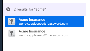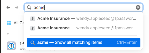 Thanks for your question! If you choose "Show all matching items" from the dropdown, or press Ctrl+Enter, 1Password will show a list of results in line: