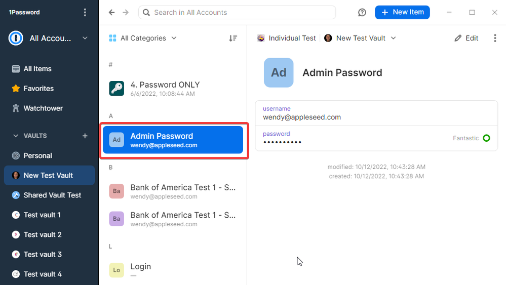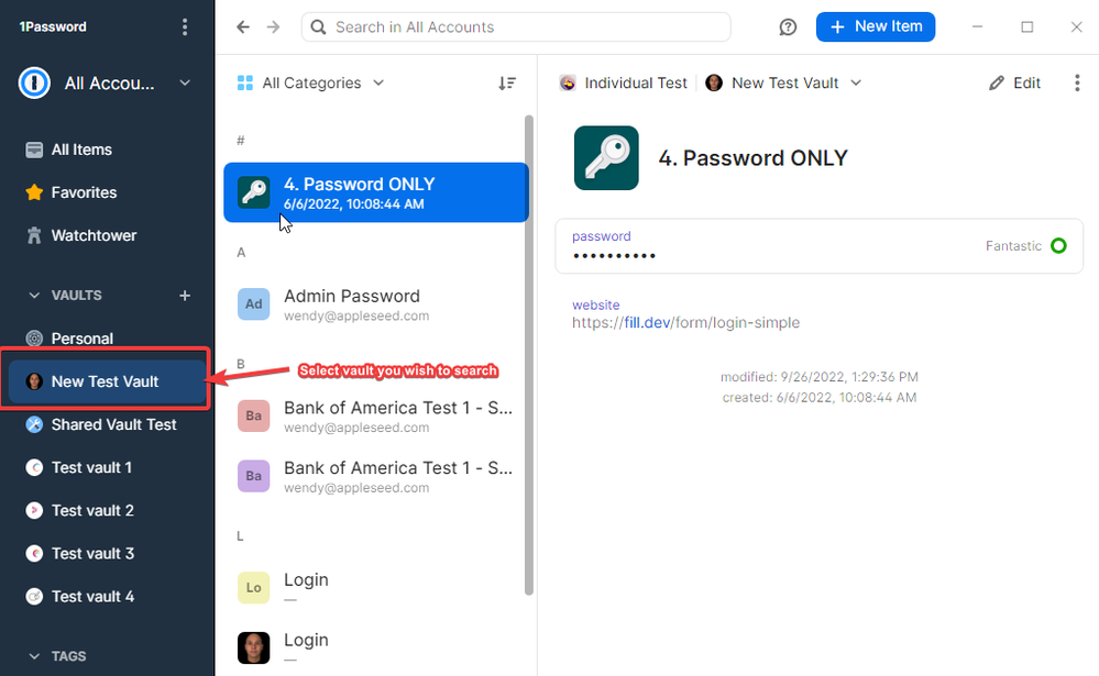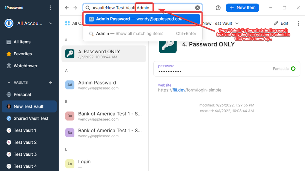 I created 7 Admin password items and want to search for the Admin password in the New Test Vault only. View the example below: