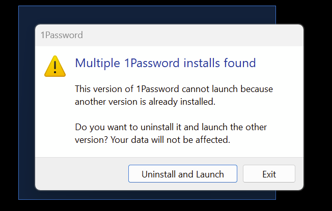 Might be related, but when Win11 updated overnight after patch Tuesday 1Password displayed this error message immediately after start up. There was only one 1Password install via download (not Windows Store). 'Uninstall and Launch' solved the problem, but interesting. Maybe it got duplicated between the Win11 and 1Password updates?