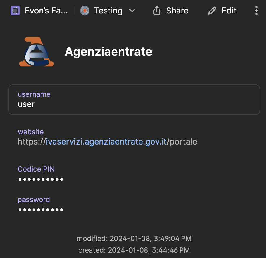 - Click "+ add more" and select "password" then edit the title from "password" to "Codice PIN" and enter your PIN below it.