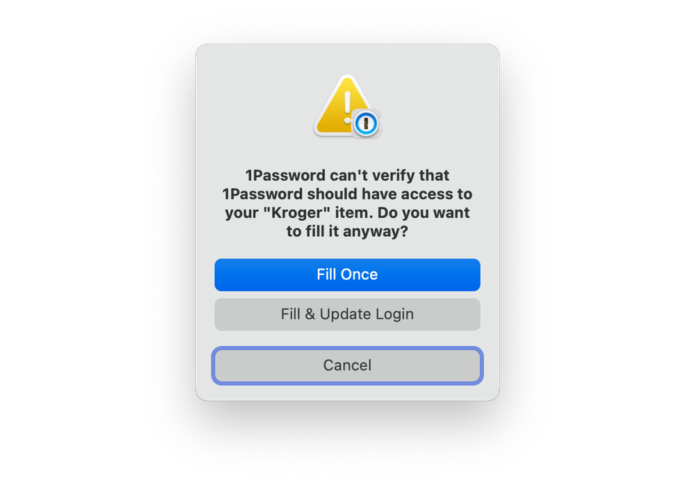 websitefield in the item doesn't match the website you're visiting, or the item doesn't have awebsiteadded at all.In this case, if you're happy that you're on the appropriate website, you can click Fill & Update Login to add that website to the item. Then, you won't see the warning any more because it'll match.