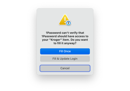 In this case, if you're happy that you're on the appropriate website, you can click Fill & Update Login to add that website to the item. Then, you won't see the warning any more because it'll match.