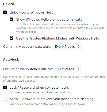 Also, each time it pops up, I am asked both for the 1password password pwd and ALSO at the seme time for the Windows Hello log in.