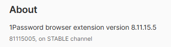 If that still doesn't work then do you see a green dot in the browser settings page? Or a different coloured dot and an error message? And if you click on About in the browser settings page what version of 1Password do you see listed?Can you also post a screenshot of the password prompt that you see? Make sure that nothing sensitive is visible in the screenshot.