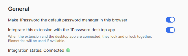 - Make sure that "Integrate this extension with the 1Password desktop app" is on.