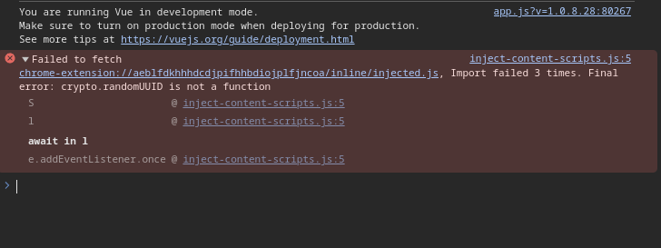 This issue only occurs on non-HTTPS sites because crypto.randomUUID() works exclusively on HTTPS. However, I still have to use HTTP sites since many on-premise servers at my workplace lack SSL certificates. Is it possible to make a fix like in the images below, or is there a more logical solution?
