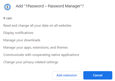 That makes more sense. Would I be notified if 1Password tries to change the permissions it needs in the future or if they grab more data, it would part of what I have to agree to in order to install the extension and I'd never know?
