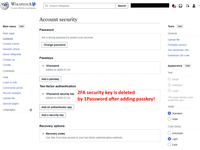 - Create a passkey, see that 1Password overwrites your Wikipedia security key with the Wikipedia passkey.