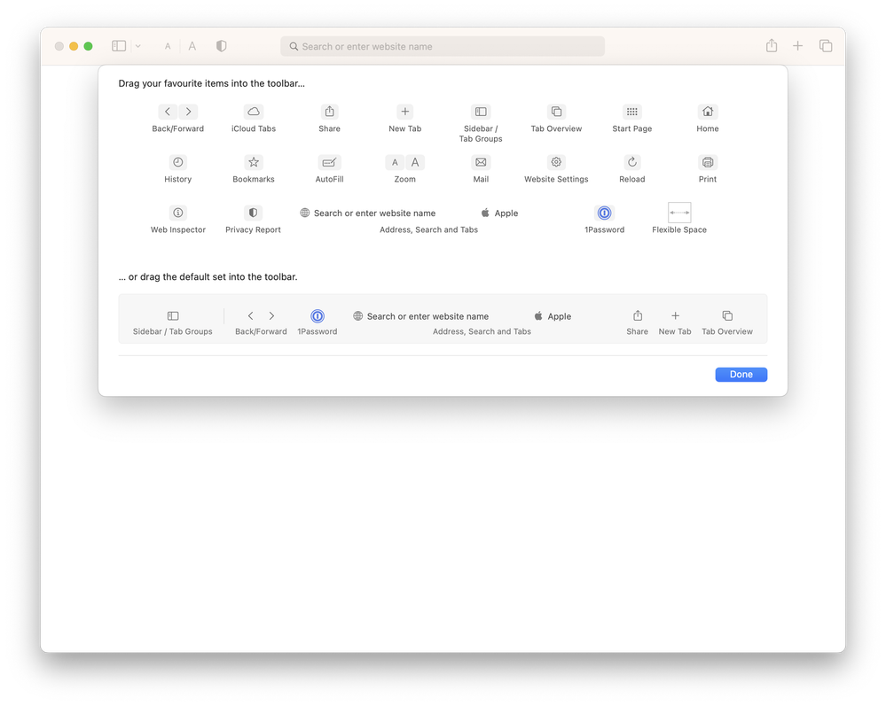 I went into Safari's extension settings and deactivated and reactivated 1Password. The extension briefly shows up in the toolbar and then immediately disappears again... 🤷