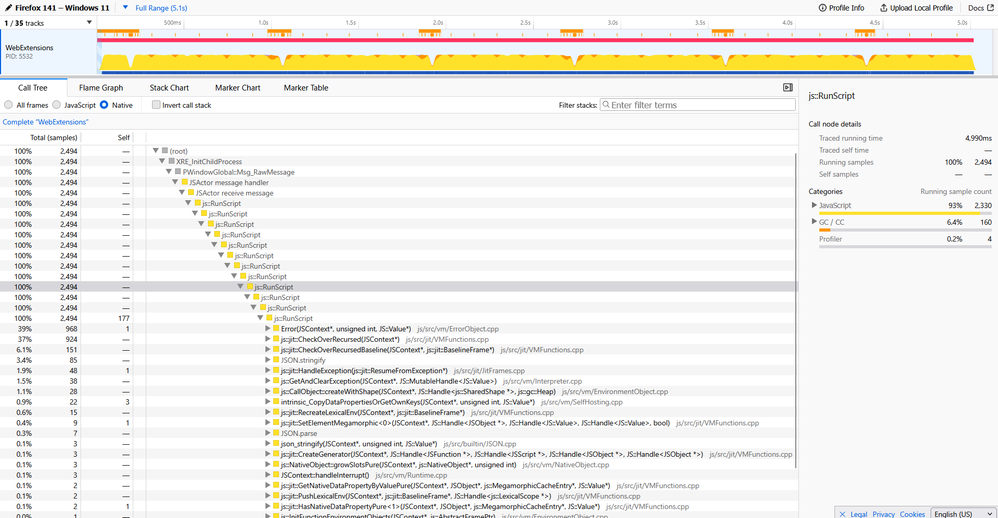 In Firefox, while the issue is happening, open the task manager by navigating to about:processes, what do you see for CPU usage for Extensions?