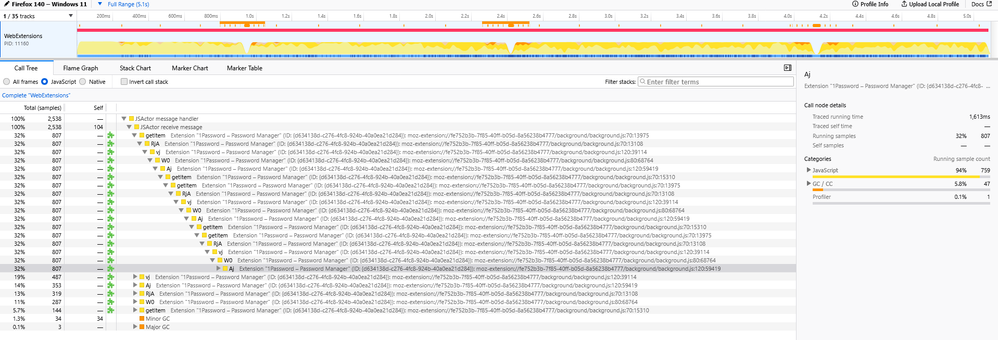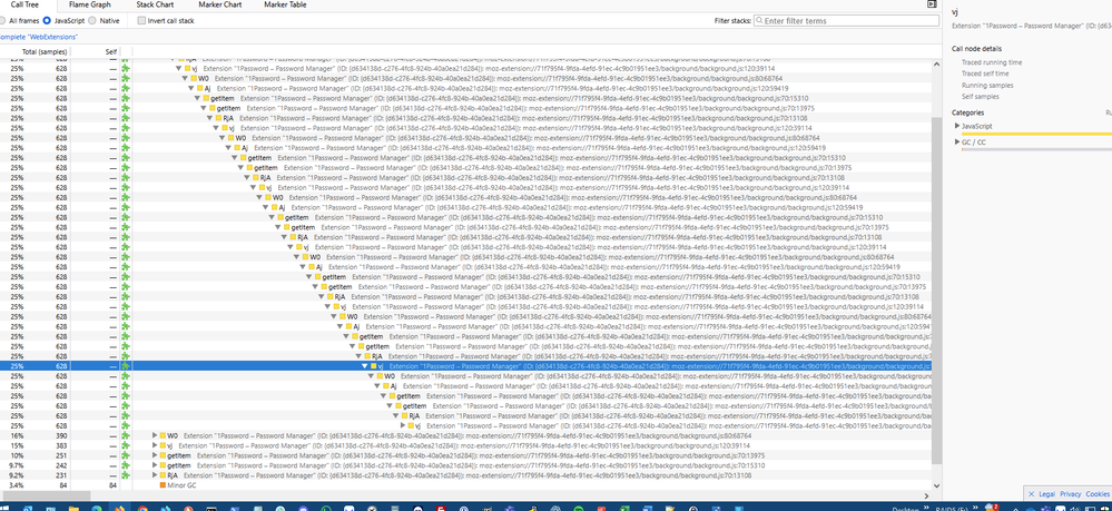 it is not clear what is triggering the issue. All I know is that sometimes in the middle of doing random actions in the browser I go to a webpage to logon to a site and try to invoke the 1P extension and nothing happens. I check Firefox Task Mgr and Extensions have floored the CPU usage. I kill the task and restart all the 1P extension and all is normal. This will also happen if 1P is the only extension enabled.