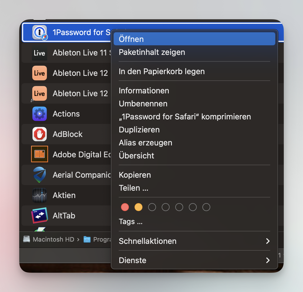 I am confused...do you mean the app in Finder "1Password for Safari" ? Right click there will give me the context menu (1),