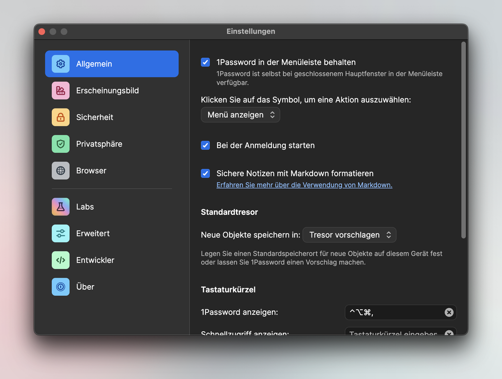 and from the MacOS menubar (next to the clock) I get screen 3, but that General section (="Allgemein") is not like the one you showed above (it is from 1Password for Mac).