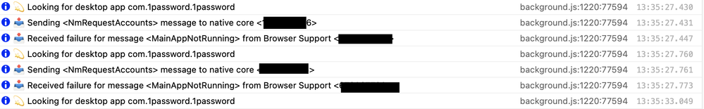 Have tried various combinations of quitting browser + app, and toggling / untoggling the "Integrate this extension with the 1Password desktop app" and "Connect with 1Password in the browser" settings in the extension / app, respectively.