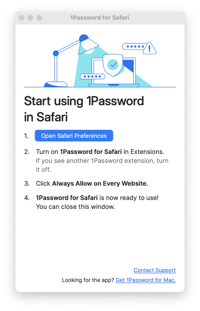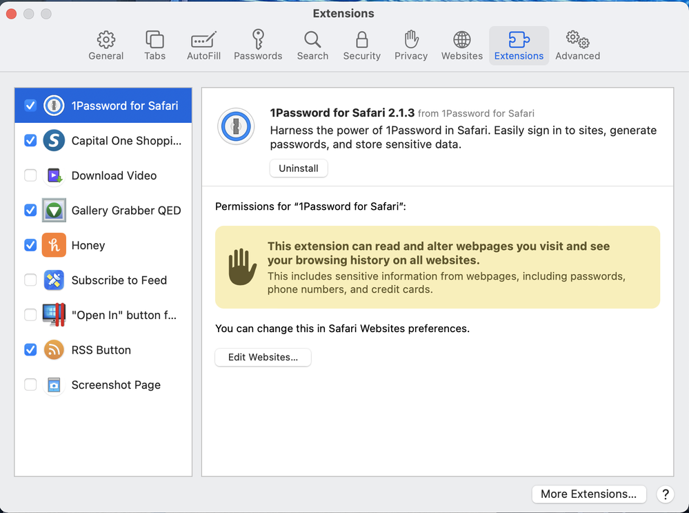 It appears you may just need to give 1Password for Safari the appropriate permissions to be able to access sites in Safari. If you click Edit Websites, do you see the option to Always Allow on Every Site?