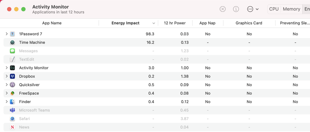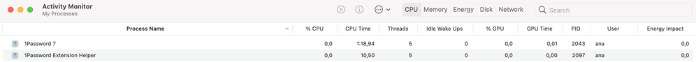 As for @ag_ana, your activity monitor is on a different tab so it is showing different information. On the top, you have "CPU" selected, try switching to the "Energy" tab and you'll see the information I posted in the screen shot. Normally, 1Password has an Energy Impact of 0.2 to 3.0, but you can see that when I created my diagnostic report, the Energy Impact is 98.3. I have since rebooted, and the Energy Impact is now 0.1