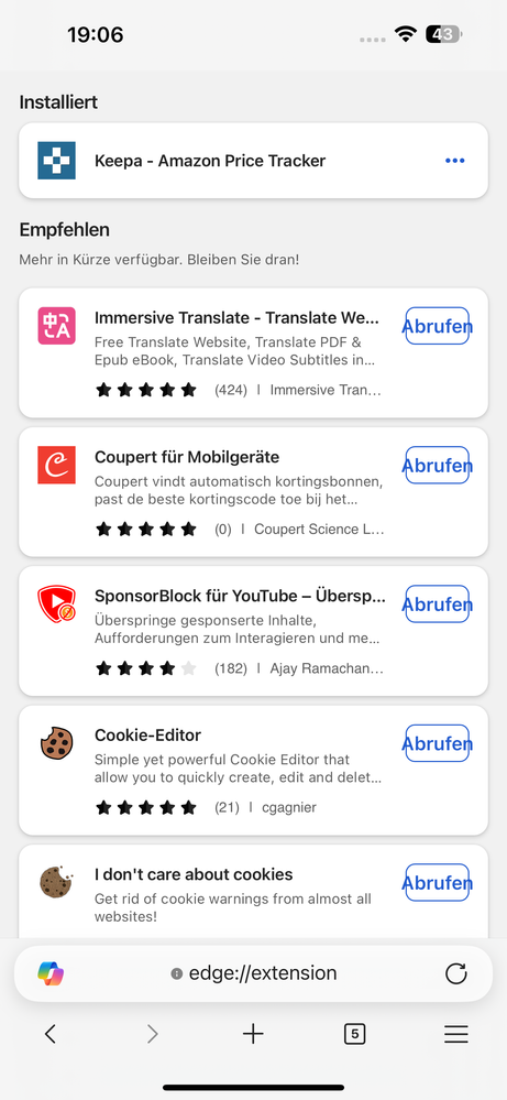 Finally the last Edge Browser Version 138 (preview) has extension support on IOS.