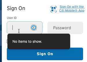 Something is wrong today in Safari. 1Password is unlocked. I go to Citibank home page to log in. The username box indicates 1P is locked. I click it and I get No Items to Show.