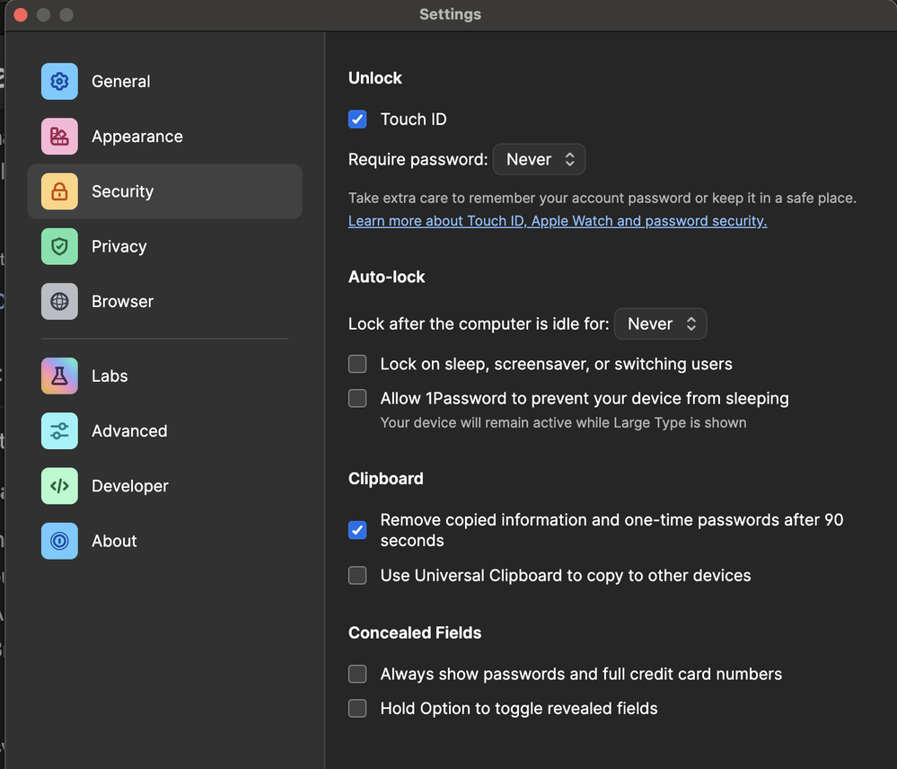 A few days ago I was prompted to update my 1Password application. Ever since then I am continually asked to type out my password despite having all settings set to "never" lock. I use Safari as my browser. I'm copying in what my settings are. Prior to the update it was working great and all I had to do was use my fingerprint to open 1Password when needed. It's a real pain in the behind to now be constantly typing out my (long) password. Please help