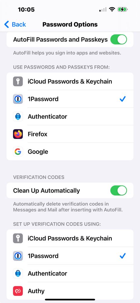 1Password is the only password manager selected. I do not have any passwords stored in keychain on my phone.Screenshot of settings for clarity: