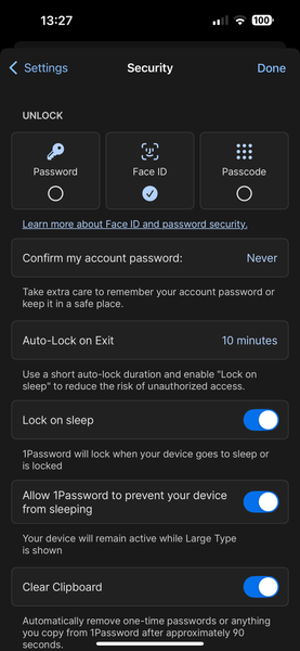 I have these setting in 1password app and I thought that this should be enough to never ask me for a password but only use FaceID