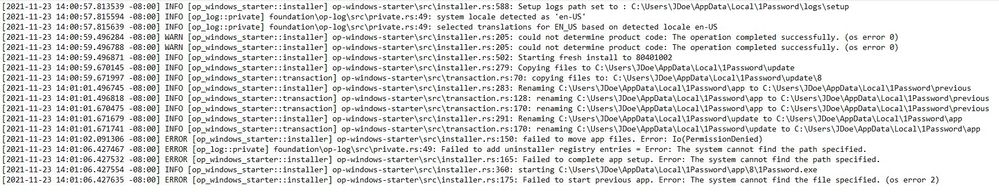 The user does not have administrator privileges if that is needed. I don't think it is with 1Password 7.