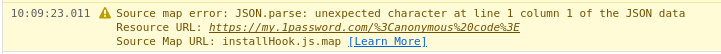 Source map error: JSON.parse: unexpected character at line 1 column 1 of the JSON data Resource URL: https://my.1password.com/%3Canonymous%20code%3E Source Map URL: installHook.js.map
