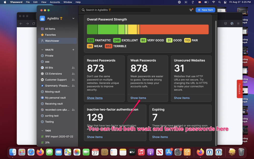 4. The watchtower view is great. I like the graphical representation of things, but wish there was a way to click an item to see the issues. For example, 4 passwords are listed as terrible. I can't click on that box though to see what they are.
