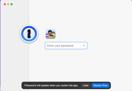 Since updating to 1Password8, I repeatedly see an overlay on my 1Password window stating "1Password will update when you restart the app" and a "Restart Now" button.