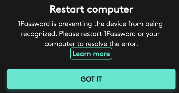 another strange issue when opening up logitech Logi Options app for my mouse, getting this error w.r.t 1 password.. please look into it.