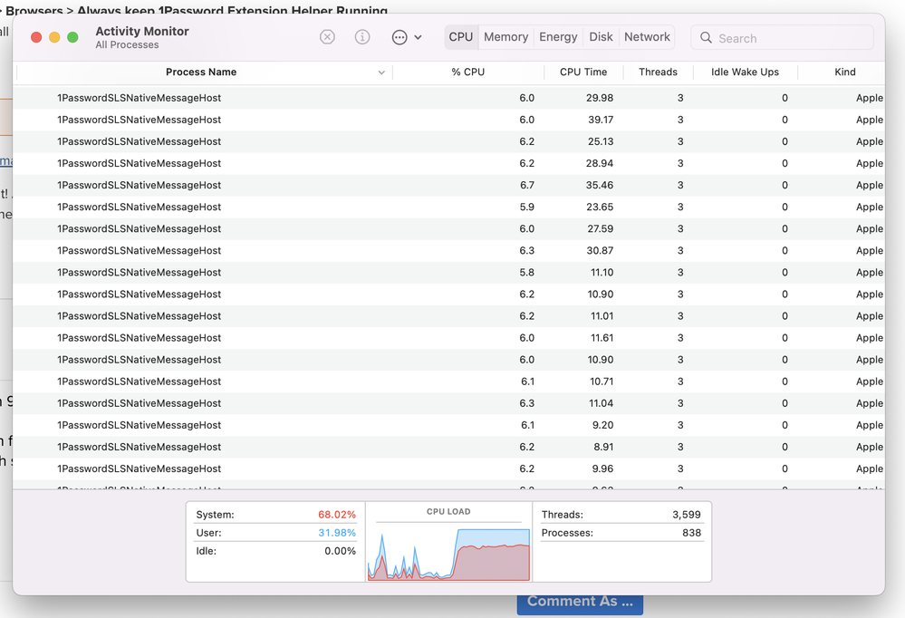 1PasswordSLSNativeMessageHost Google Chrome Beta 100 Saturating CPU